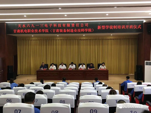 7410026月30日下午,由天水六九一三電子科技有限責(zé)任公司和甘肅機(jī)電職業(yè)技術(shù)學(xué)院聯(lián)合舉辦的“企業(yè)新型學(xué)徒制培訓(xùn)”開班儀式在甘肅機(jī)電學(xué)院六樓會議室隆重舉行。天水市人力資源和社會保障局副局長劉宇,甘肅機(jī)電職業(yè)技術(shù)學(xué)院黨委副書記、院長趙彥軍,甘肅機(jī)電職業(yè)技術(shù)學(xué)院黨委委員、副院長毛文輝,天水市人力資源和社會保障局職業(yè)能力建設(shè)科科長胡博及公司領(lǐng)導(dǎo)、機(jī)電學(xué)院相關(guān)領(lǐng)導(dǎo)、老師、學(xué)員共計50多人參加了開班儀式。